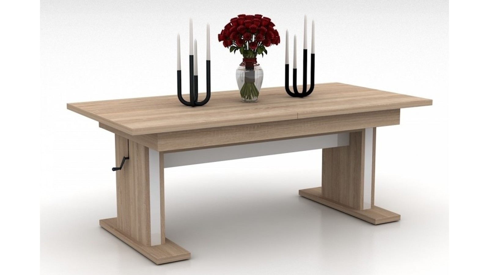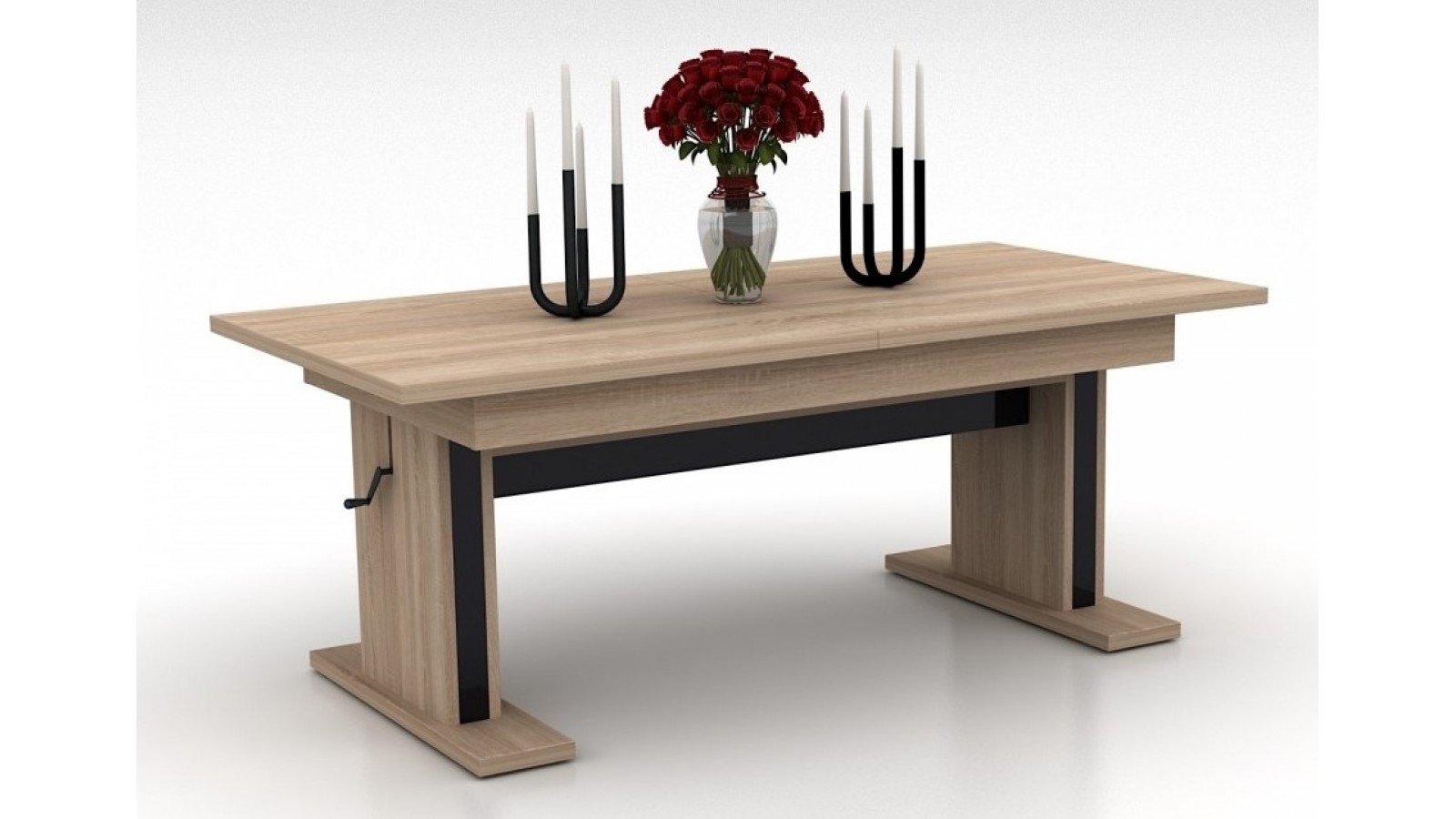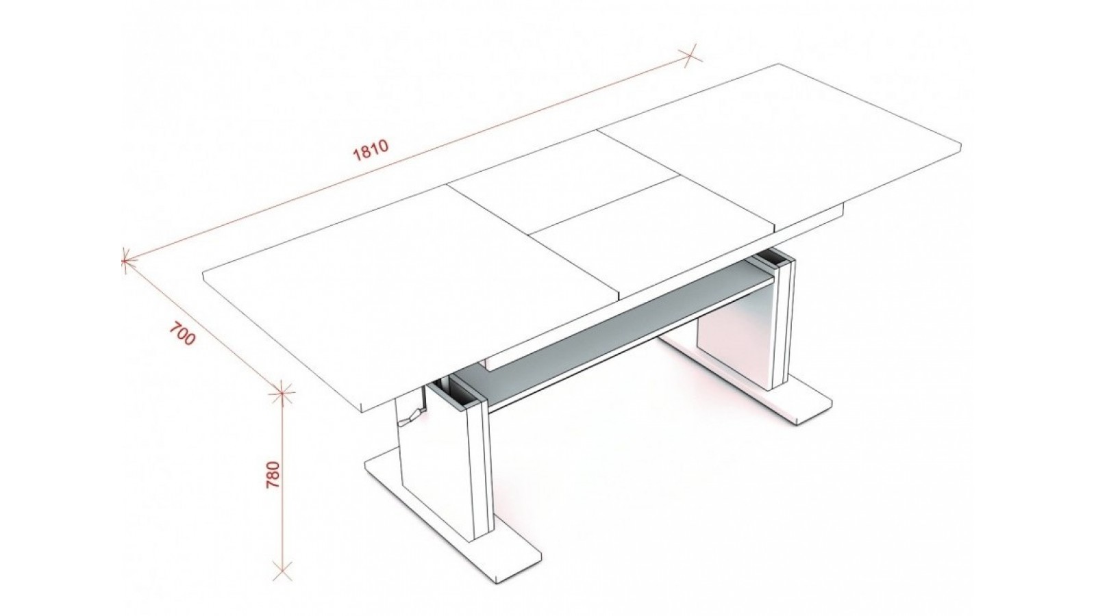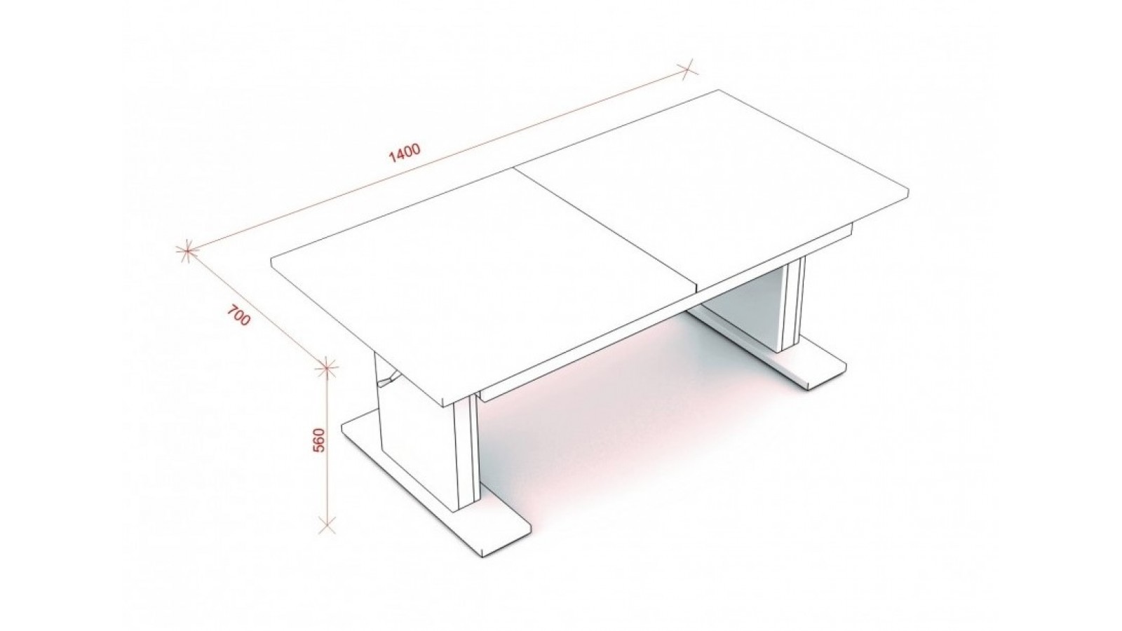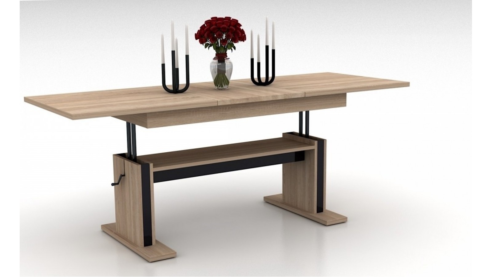 Конструкцията е изработена от ПДЧ 18 мм, плот с дебелина 25 мм, метален механизъм за повдигане до желаното ниво, разтегателен плот.