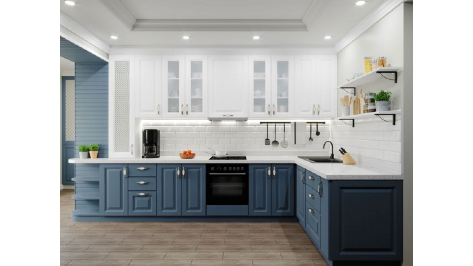 Ретро класика в бяло и синьо с много елементи – етажерки, витрини, фрезовани врати. Общата дължина е 5,8 м, а височината на горния ред стига до тавана, като за финална щриха имаме корниз от МДФ. Отварянето на всички врати и чекмеджета е с външни дръжки. На витрините има поставен допълнителен декоративен елемент - врата тип „решетка“. Плотът е задържан в бял тон за комбинация с горния ред, а гърбът е плочки, имитиращи малки гланцови тухли отново в бяло.Кухнята може да бъде изработена по индивидуални размери и с избор на други цветове.